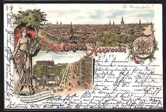 Lithographie Hannover, Gesamtansicht, die Georgstrasse, das Wappen