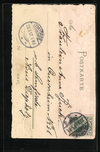 Personenbezogene Daten auf der Rückseite der Karte wurden durch blauen Textmarker unkenntlich gemacht. Die blauen Stellen sind auf die Vorderseite durchgeweicht und wirken sich negativ auf das Postkartenfoto aus