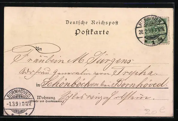 Personenbezogene Daten auf der Rückseite der Karte wurden durch blauen Textmarker unkenntlich gemacht. Die blauen Stellen sind auf die Vorderseite durchgeweicht und wirken sich negativ auf das Postkartenfoto aus