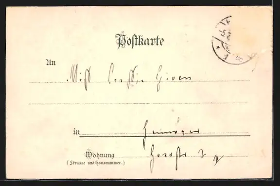 Personenbezogene Daten auf der Rückseite der Karte wurden durch blauen Textmarker unkenntlich gemacht. Die blauen Stellen sind auf die Vorderseite durchgeweicht und wirken sich negativ auf das Postkartenfoto aus