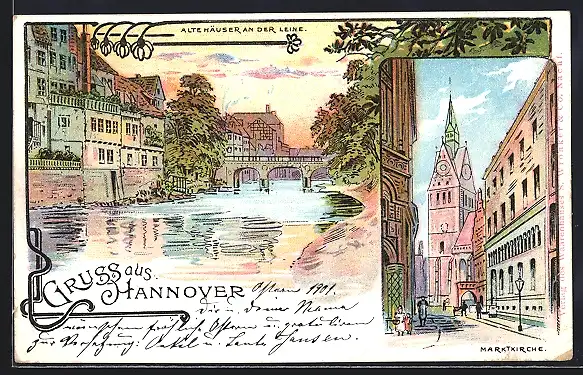 Lithographie Hannover, Marktkirche, Alte Häuser an der Leine