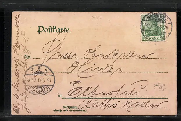 Personenbezogene Daten auf der Rückseite der Karte wurden durch blauen Textmarker unkenntlich gemacht. Die blauen Stellen sind auf die Vorderseite durchgeweicht und wirken sich negativ auf das Postkartenfoto aus