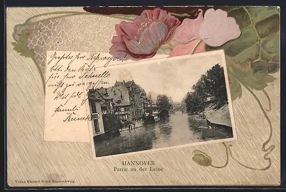 Lithographie Hannover, Partie an der Leine, Blume, Passepartout