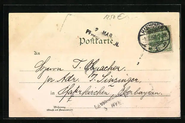 Personenbezogene Daten auf der Rückseite der Karte wurden durch blauen Textmarker unkenntlich gemacht. Die blauen Stellen sind auf die Vorderseite durchgeweicht und wirken sich negativ auf das Postkartenfoto aus