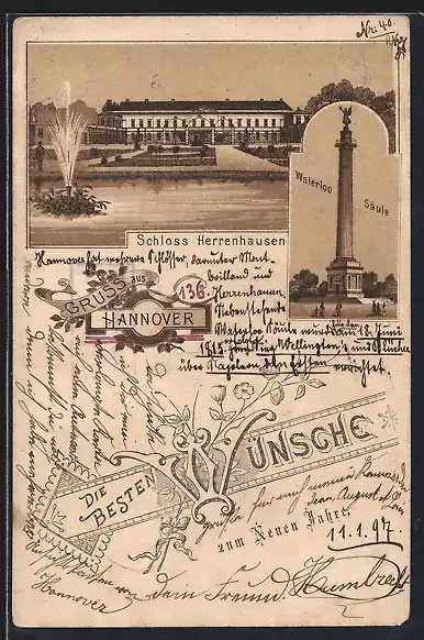 Lithographie Hannover, Schloss Herrenhausen, Waterloo-Säule