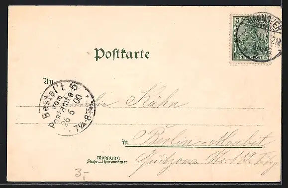 Personenbezogene Daten auf der Rückseite der Karte wurden durch blauen Textmarker unkenntlich gemacht. Die blauen Stellen sind auf die Vorderseite durchgeweicht und wirken sich negativ auf das Postkartenfoto aus
