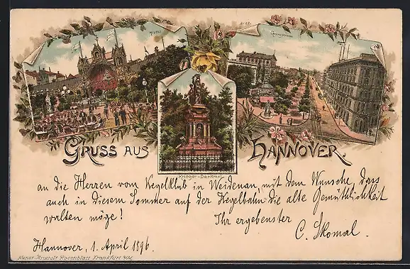 Lithographie Hannover, Tivoli, Georgstrasse, Kriegerdenkmal