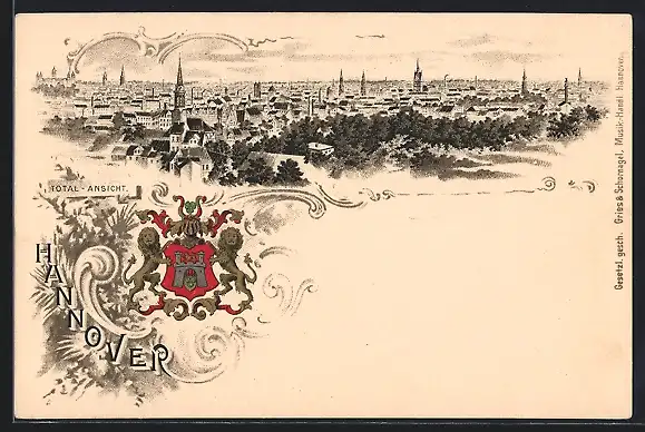 Lithographie Hannover, Wappen der Stadt, Totalansicht von oben