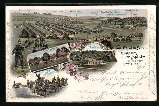 Lithographie Hardt / Münsingen, Truppenübungsplatz mit Casino