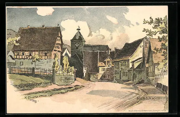 Lithographie Hebsack / Remshalden, Strassenpartie mit Kirche