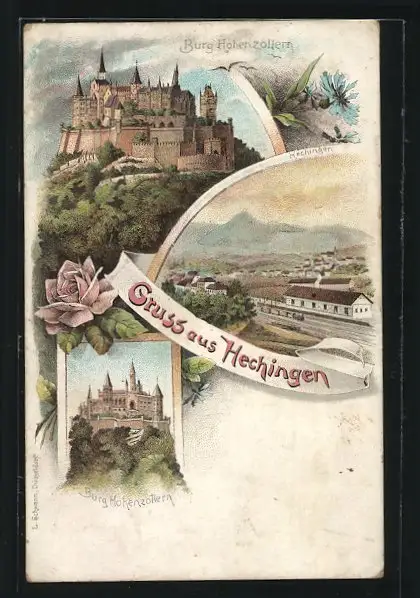 Lithographie Hechingen, Burg Hohenzolern, Ortsansicht mit Bahnhof