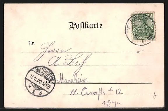 Personenbezogene Daten auf der Rückseite der Karte wurden durch blauen Textmarker unkenntlich gemacht. Die blauen Stellen sind auf die Vorderseite durchgeweicht und wirken sich negativ auf das Postkartenfoto aus