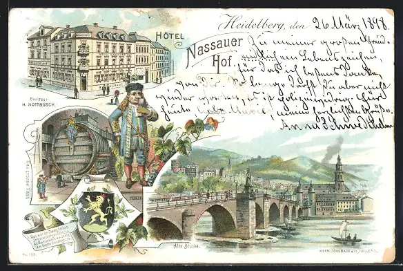 Lithographie Heidelberg, Hotel Nassauer Hof, Alte Brücke