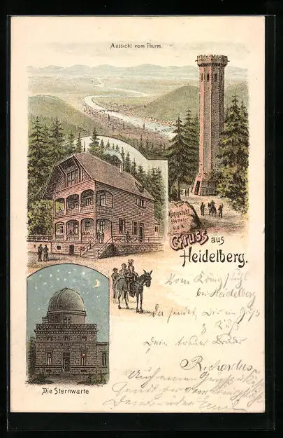 Lithographie Heidelberg, Königsstuhl, Sternwarte, Turm