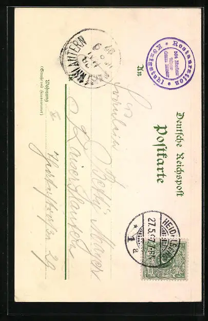 Personenbezogene Daten auf der Rückseite der Karte wurden durch blauen Textmarker unkenntlich gemacht. Die blauen Stellen sind auf die Vorderseite durchgeweicht und wirken sich negativ auf das Postkartenfoto aus