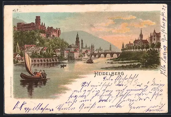Lithographie Heidelberg / Neckar, Leute in Booten aus Wasser, Brücke, mit Spruch