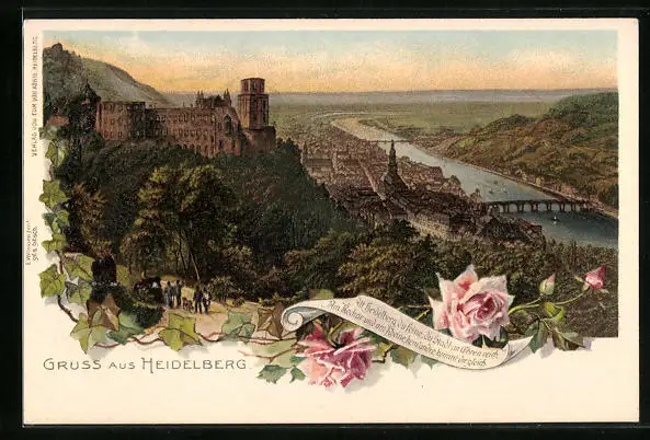 Lithographie Heidelberg / Neckar, Totale mit Schloss