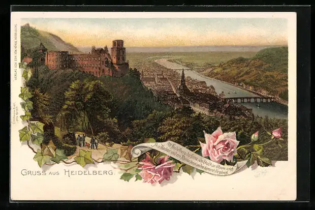 Lithographie Heidelberg / Neckar, Totale mit Schloss