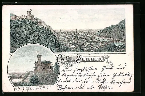 Lithographie Heidelberg, Ortsansicht mit Philisophenhöhe