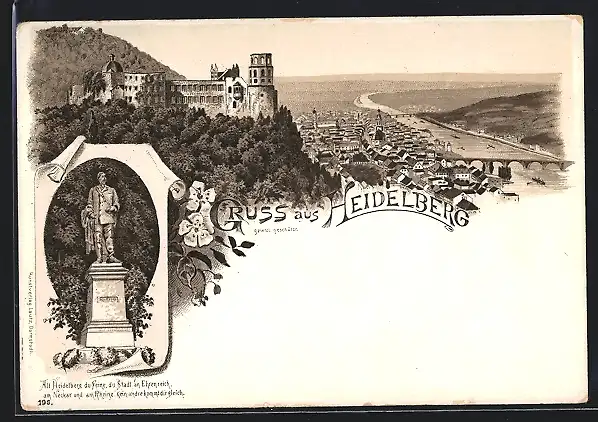 Lithographie Heidelberg, Ortsansicht mit Scheffel Denkmal