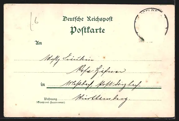 Personenbezogene Daten auf der Rückseite der Karte wurden durch blauen Textmarker unkenntlich gemacht. Die blauen Stellen sind auf die Vorderseite durchgeweicht und wirken sich negativ auf das Postkartenfoto aus
