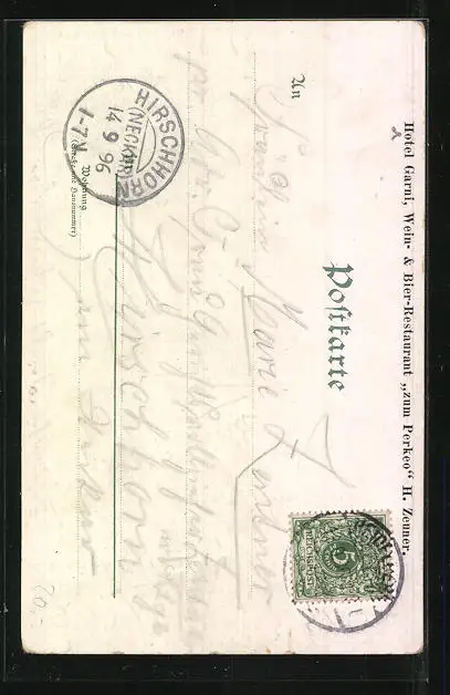 Personenbezogene Daten auf der Rückseite der Karte wurden durch blauen Textmarker unkenntlich gemacht. Die blauen Stellen sind auf die Vorderseite durchgeweicht und wirken sich negativ auf das Postkartenfoto aus