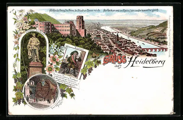 Lithographie Heidelberg, Scheffer Denkmal, Das grosse Fass, Perkeo