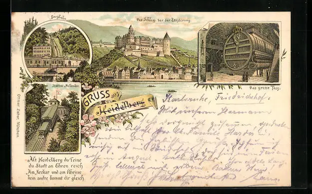 Lithographie Heidelberg, Schloss, Das grosse Fass, Bergbahn