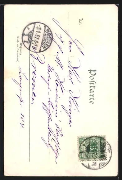 Personenbezogene Daten auf der Rückseite der Karte wurden durch blauen Textmarker unkenntlich gemacht. Die blauen Stellen sind auf die Vorderseite durchgeweicht und wirken sich negativ auf das Postkartenfoto aus