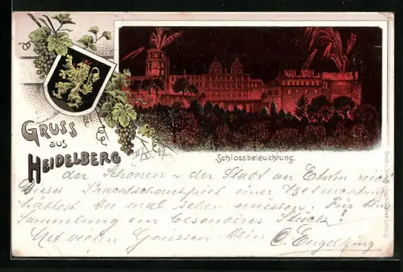 Lithographie Heidelberg, Schlossbeleuchtung, Feuerwerk, Wappen
