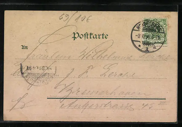 Personenbezogene Daten auf der Rückseite der Karte wurden durch blauen Textmarker unkenntlich gemacht. Die blauen Stellen sind auf die Vorderseite durchgeweicht und wirken sich negativ auf das Postkartenfoto aus