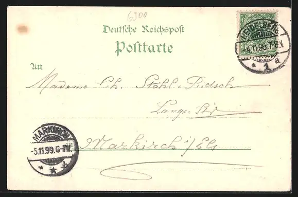 Personenbezogene Daten auf der Rückseite der Karte wurden durch blauen Textmarker unkenntlich gemacht. Die blauen Stellen sind auf die Vorderseite durchgeweicht und wirken sich negativ auf das Postkartenfoto aus
