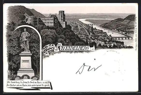 Lithographie Heidelberg, Stadt-Panorama, Scheffel-Denkmal