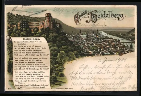 Lithographie Heidelberg, Totalansicht aus der Vogelschau, Gedicht