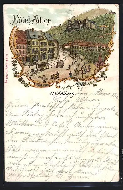 Lithographie Heidelberg, Totalansicht mit Hotel Adler