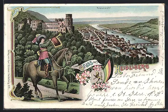 Lithographie Heidelberg, Totalansicht mit Trompeter zu Pferde, Wappen, Fahne
