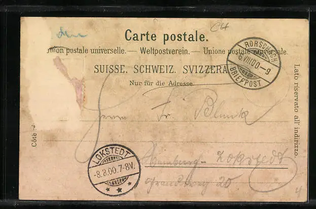 gelaufen 1900, Briefmarke entfernt, rückseitig Klebe- und Papierreste, rückseitig Oberflächenschaden, guter Zustand