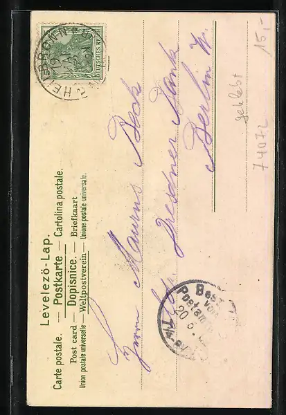 Personenbezogene Daten auf der Rückseite der Karte wurden durch blauen Textmarker unkenntlich gemacht. Die blauen Stellen sind auf die Vorderseite durchgeweicht und wirken sich negativ auf das Postkartenfoto aus