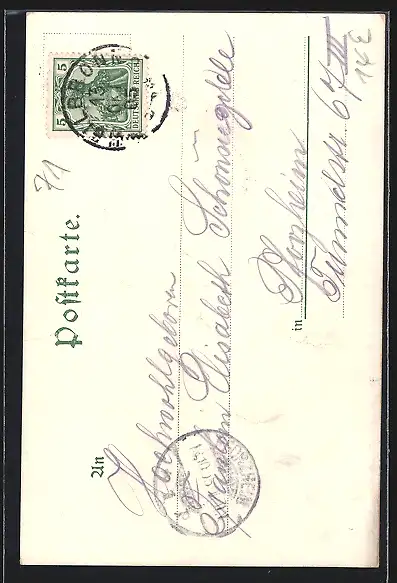 Personenbezogene Daten auf der Rückseite der Karte wurden durch blauen Textmarker unkenntlich gemacht. Die blauen Stellen sind auf die Vorderseite durchgeweicht und wirken sich negativ auf das Postkartenfoto aus