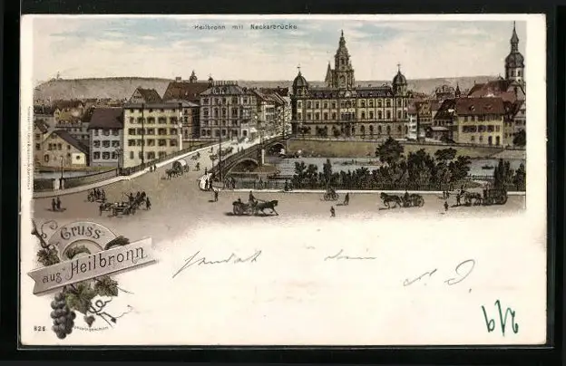 Lithographie Heilbronn, Uferpartie mit Neckarbrücke