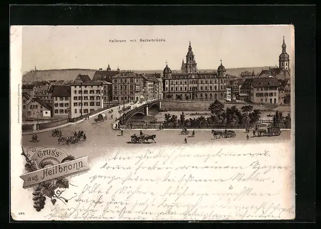 Lithographie Heilbronn, Uferpartie mit Neckarbrücke