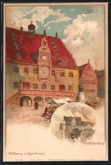 Lithographie Heilbronn a. Neckar, Rathaus und Kätchenburg
