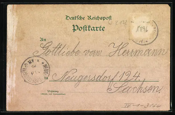 gelaufen 1896, Briefmarke entfernt, Eckknick oben li., guter Zustand