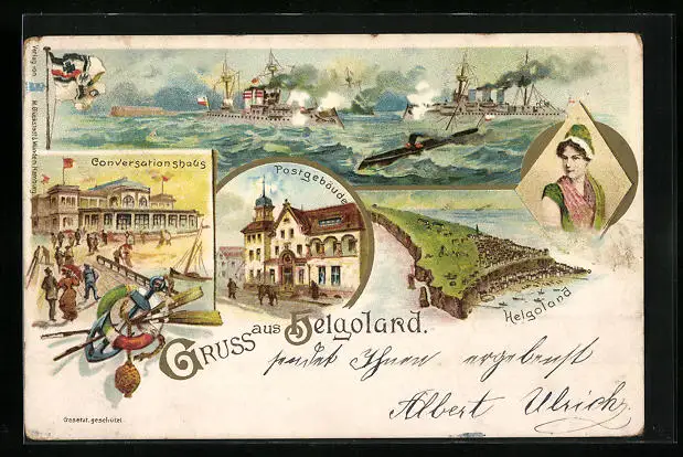Lithographie Helgoland, Hafenpartie mit Postgebäude