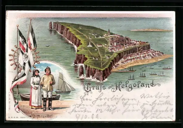 Lithographie Helgoland, Ortsansicht aus der Vogelschau, Helgoländer und Fahnen