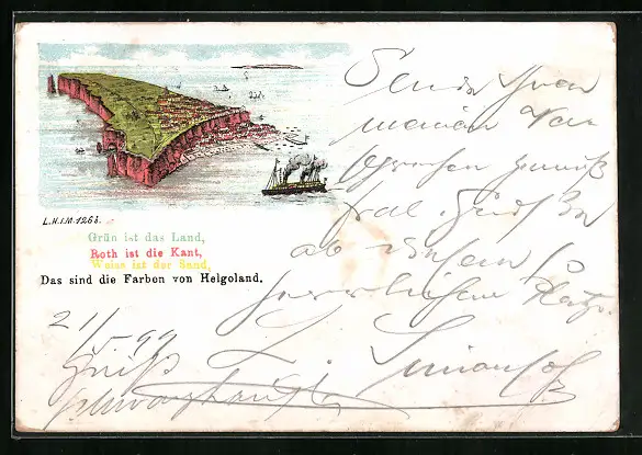 Lithographie Helgoland, Ortsansicht mit Dampfer