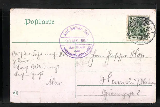 gelaufen 1907, Eckknick li. oben, minimaler Einriss re. unten, guter Zustand