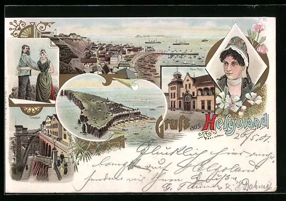 Lithographie Helgoland, Strand, Treppe, Neue Post
