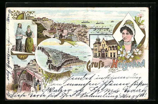Lithographie Helgoland, Treppe, Steilufer, Helgoländer Paar, Gesamtansicht, Gesamtansicht