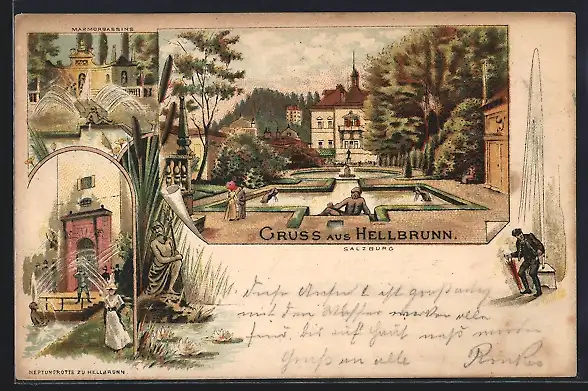 Lithographie Hellbrunn, Marmorbassin und Neptungrotte